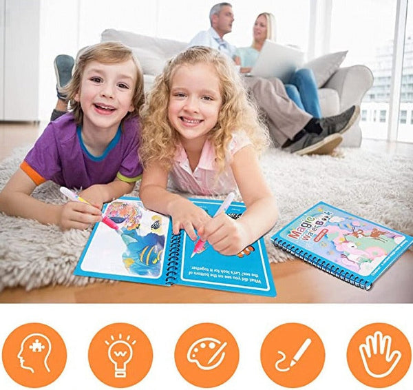 O Livro Mágico usa uma caneta de água que revela cores nas páginas. Após secar, o livro pode ser pintado novamente, proporcionando diversão contínua sem desperdício.